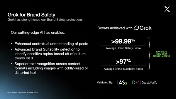 همچنین تیم تبلیغاتی X اعلام کرد که Grok باعث بهبود ایمنی برندها شده، که یکی از دغدغههای اصلی تبلیغدهندگان پس از ورود ماسک به X بوده است.