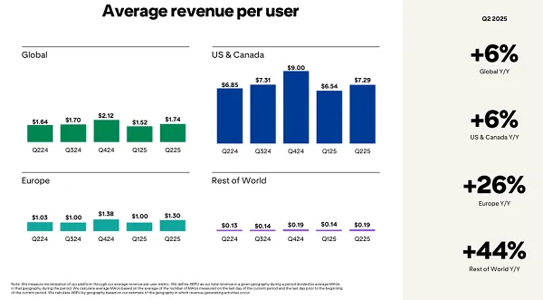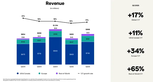 با این وجود، پینترست در زمینه درآمدزایی از کاربران موجود پیشرفت داشته است. این شرکت در سه‌ماهه دوم ۲۰۲۵، ۹۹۸ میلیون دلار درآمد کسب کرده که ۱۷٪ افزایش سالانه را نشان می‌دهد.