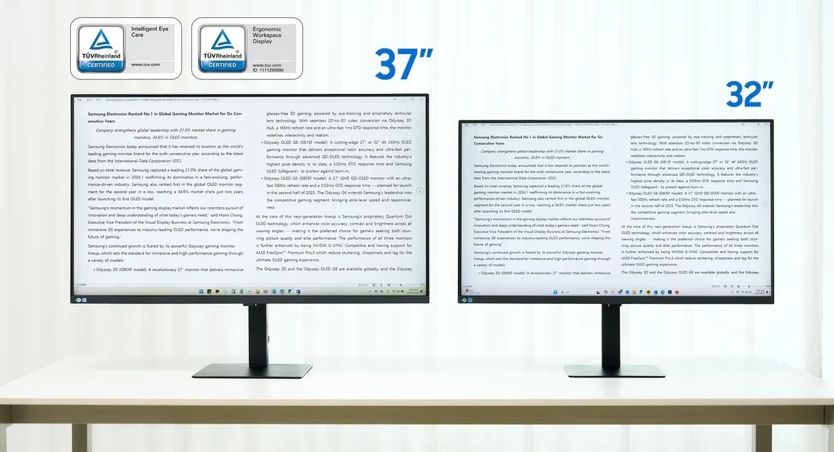 مانیتور ۳۷ اینچی با نسبت تصویر ۱۶:۹ طراحی شده است. سامسونگ اعلام کرده که این مدل نسبت به نسخه ۳۲ اینچی، با وجود افزایش پنج اینچی، همچنان وضوح UHD را با جزئیات دقیق حفظ کرده و فضای کاری بیشتری در اختیار کاربران قرار میدهد. همچنین متنها روی این نمایشگر بزرگتر از مدل ۳۲ اینچی نمایش داده میشوند و جزئیات بهتر دیده میشوند؛ موضوعی که در همکاریهای گروهی، ارائه مطالب یا نمایش محتوا برای همکاران کاربرد فراوانی دارد.