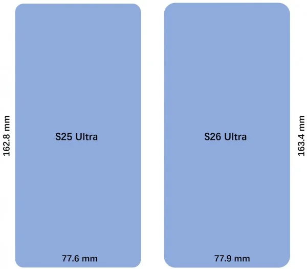 Galaxy S26 Ultra با ارتفاع 163.4 میلیمتر و عرض 77.9 میلیمتر عرضه میشود؛ این یعنی به ترتیب ۰.۶ میلیمتر بلندتر و ۰.۳ میلیمتر عریضتر از مدل قبلی (S25 Ultra) است.