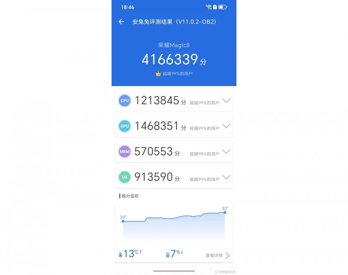 براساس این اسکرینشات، Honor Magic8 توانسته در AnTuTu v11 به امتیاز 4,166,339 دست یابد. جزئیات امتیازها به شرح زیر است: