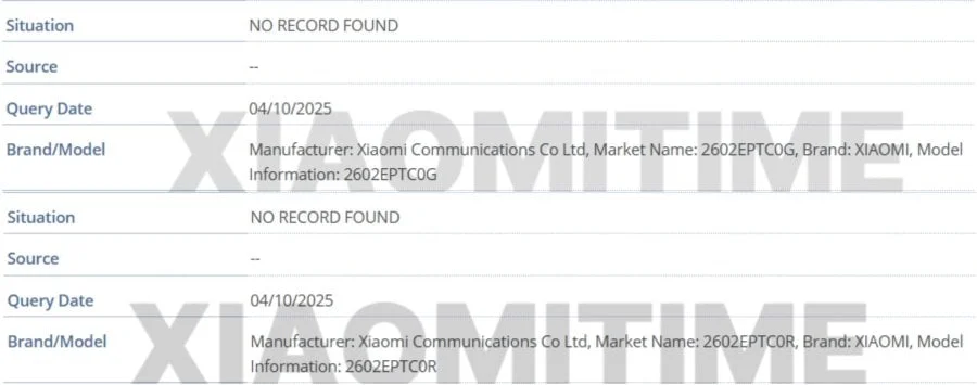 سری بعدی گوشیهای Xiaomi T بهتازگی در پایگاه داده IMEI مشاهده شدهاند. این دستگاهها با شماره مدلهای 2602EPTC0G و 2602EPTC0R ثبت شدهاند که به گفته منبع XiaomiTime احتمالاً به گوشیهای Xiaomi 17T و Xiaomi 17T Pro تعلق دارند.