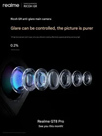 دوربین GT 8 Pro از موتور الگوریتمی هوشمند Ricoh بهره می‌برد که هدف آن حذف مشکلات رایج عکاسی موبایل مانند شارپ‌سازی بیش از حد، اشباع رنگ زیاد و لکه‌گذاری مصنوعی تصاویر است. به گفته‌ی Realme، کاربران می‌توانند انتظار پردازش پیکسل‌ها در سطح فایل RAW، عمق رنگ واقعی ۱۰ بیتی و فناوری Ultra-Sense HDR را برای تعادل طبیعی میان نور و سایه داشته باشند.