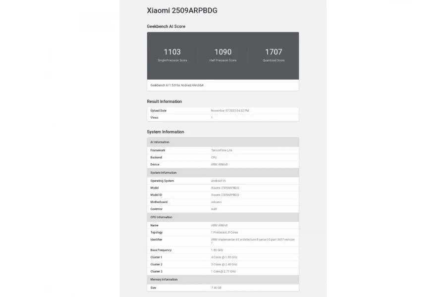 تراشه دستگاه، Qualcomm Snapdragon 7s Gen 4 است و نتایج Geekbench AI نشان میدهد که امتیازهای آن به شرح زیر است: