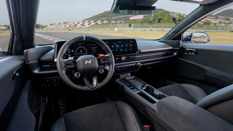 داخل کابین کاملاً اسپرت طراحی شده، با رنگ مشکی و جزئیات آبی Performance Blue، صندلیهای عمیق Alcantara و چرم و فرمان N با دو دکمه برای حالتهای رانندگی سفارشی.