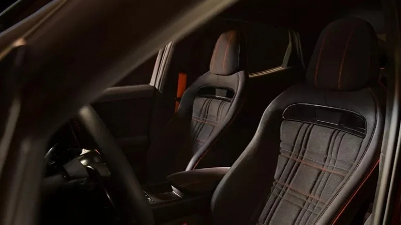 داخل کابین نیز همان روح اسپرت حفظ شده است. صندلیها، رودریها و کنسول میانی با متریال شبهجیر Chamude پوشیده شدهاند. دوختهای نارنجی و طوسی و تزیینات فلز تیره و مشکی براق، حس لوکس بودن را تقویت میکنند.