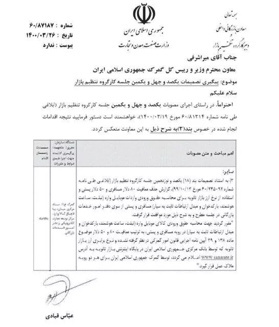 در سال ۱۴۰۰، وزارت صمت معافیتهای گمرکی ۸۰ و ۵۰ دلاری برای واردات مسافری و پستی گوشی موبایل، تبلت و ساعت هوشمند را لغو کرد و نرخ ارز سامانه سنا را جایگزین نرخهای پیشین برای محاسبه حقوق ورودی نمود. طبق مصوبه جدید، دیگر هیچ معافیت ارزی برای این کالاها در نظر گرفته نشده و نرخ ارز بازار ثانویه (سنا) تنها ملاک محاسبه حقوق ورودی در هر دو رویه مسافری و پستی تعیین شد.