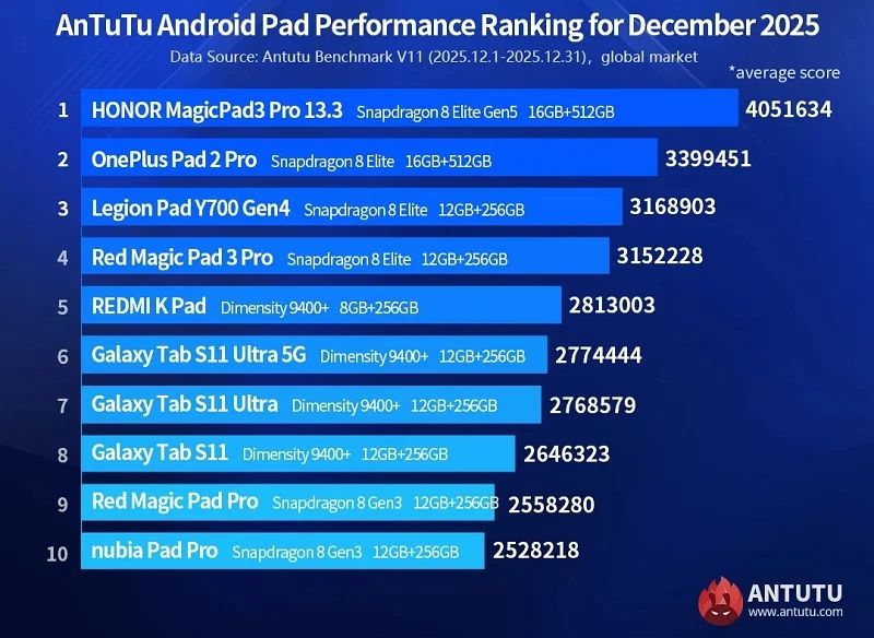 در مجموع، نتایج دسامبر ۲۰۲۵ نشان میدهد که Honor MagicPad 3 Pro در حال حاضر بیرقیبترین تبلت اندرویدی از نظر عملکرد خام محسوب میشود و فاصلهای معنادار با سایر رقبا ایجاد کرده است.