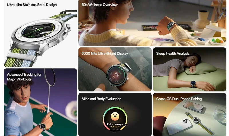 پایش سلامت با سنسور ضربان قلب ۸ کاناله، سنسور اکسیژن خون ۱۶ کاناله و سنسور دمای مچ انجام میشود. امکانات دیگر شامل تحلیل خواب، پایش استرس، ارزیابی ذهن-بدن و ارائه وضعیت سلامت در ۶۰ ثانیه است. ساعت از استانداردهای مقاومت IP68 و 5ATM برخوردار است و ویژگی Splash Touch عملکرد لمسی صفحه را در شرایط خیس حفظ میکند.