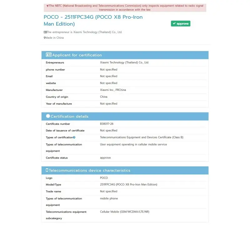 این گوشی اخیراً توسط NBTC تایلند برای عرضه رسمی تأیید شده و شماره مدل آن 2511FPC34G است. شایعات حاکی از آن است که Poco X8 Pro بر پایه گوشی Redmi Turbo 5 ساخته خواهد شد که قرار است همین ماه در چین رونمایی شود. همچنین احتمالاً نسخهای تحت عنوان Poco X8 Pro Max هم عرضه میشود که نسخه بازبرند شده Redmi Turbo 5 Max خواهد بود.