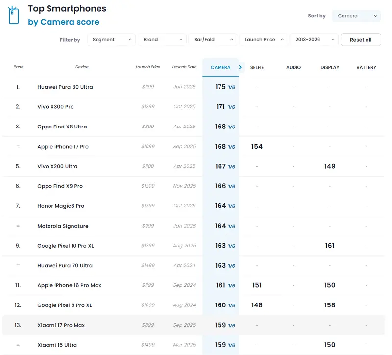 با وجود ثبت نتایج فنی قابلتوجه در آزمایشهای تخصصی، گوشی Xiaomi 17 Pro Max نتوانسته جایگاهی در میان ۱۰ گوشی برتر جدول دوربین DXOMARK به دست آورد. این پرچمدار جدید شیائومی با کسب امتیاز کلی ۱۵۹ در رتبه سیزدهم قرار گرفته و پایینتر از رقبایی از برندهای هواوی، ویوو، اوپو، اپل، گوگل، آنر و حتی جدیدترین پرچمدار موتورولا ایستاده است.